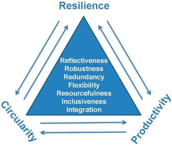 In relation to the requirements of the Recommendations, the paper, developed as part of the Projects of National Relevance (PRIN 2010–2011), identifies the relationships between the concepts of Circularity, Productivity and Resilience as an effective key to interpreting the phenomena that occur in the HUL to achieve the goals of Agenda 2030 of inclusive, safe, resilient and sustainable cities (Figure 1).