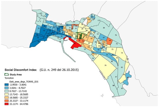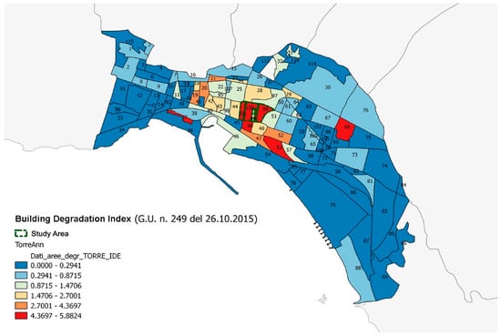 Multiscale analysis allows us to turn our attention to the specific context of Torre Annunziata and GIS tools support the construction of thematic maps for the definition of multidimensional systems. The Geographic Information System (GIS) allows to overlay the knowledge of spatial data [] reducing the information (numerical indicators, open data, points of interest, etc.) in the complex and systemic territorial context. The integration of knowledge tools through GIS allows to build complex maps containing information on the quality of the environment and landscape [].