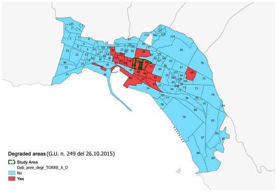 The municipality of Torre Annunziata is an important example of a pattern that is generated and renewed, developing a productive propensity offered by its climatic and morphologic position, as well as by technological progress. The social-urban system of Torre Annunziata is in fact strongly characterized by its original manufacturing vocation and by a dense system of tangible and intangible relations between the physical/ environmental, social and economic components [,]. In particular, its historic center has a precise connotation resulting from the interaction between the environmental characteristics of the landscape and the manufacturing and residential production needs; it represents the expression of the changes over time due to the technological innovation in the manufacture of pasta. For centuries, the entire municipal economy has revolved around the synergies between places and resources: exposure to the sun and winds, the construction characteristics of the settlement are the factors that allowed production, increased by the presence of the port area for the import of wheat from Russia and the export of dry pasta. Authors have interpreted this peculiar settlement system as Productive Urban Landscape: “complex and adaptive system, result over time of procedures and methods for the supply of resources, their processing and distribution of the finished product, where technological opportunities are connotative aspect” []. The post-war productive divestment and the residential re-use of the historical center have exposed the urban system to conditions of physical, social and economic vulnerability over time. The port area, a great potential within the Gulf of Naples, has also been abandoned and cut off from the city. Currently the municipality is in a state of social discomfort and physical degradation, generated by the processes of transition.