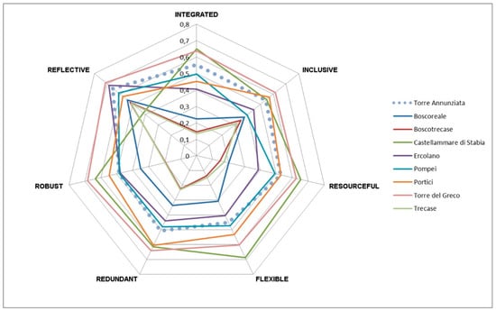 Thanks to the standardization and aggregation of indicators with the methodology of perfect point [], for each of the resilience indicators the values at the municipal scale have been identified. In this way it was possible to measure and compare the resilience qualities expressed by the different municipalities belonging to the Buffer zone of Pompeii. The ideal point on which the model is based identifies the ideal value assigned to a given criterion, which represents the optimal value the decision maker should strive for. This parameter coincides with the maximum value of the criterion examined. The worst point is the opposite of the ideal point and the default value is the worst in the attribute table. The following spider diagram [] permits to compare the performance in terms of resilience expressed by different municipalities belonging to the buffer zone (Figure 6):