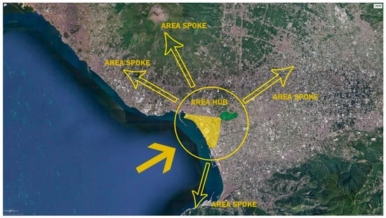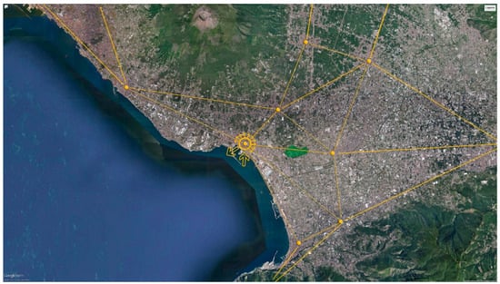 Scenario 2 (Figure 8): strategic cultural-touristic plan, based on “Restoring the project life of Pompeii: a sustainable development project for the Vesuvius area”. The project involves the creation of a cultural-tourist district, with public and private funding, focused on the enhancement of archaeological sites in five municipalities in the buffer zone (Pompeii, Herculaneum and Torre Annunziata, Castellammare di Stabia and Boscoreale) and services located in an abandoned industrial site, on the east coast of Torre Annunziata, near the archaeological excavations of Pompeii.