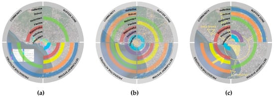 Conceptual framework of comparison among scenarios in four domains. (a) Scenario 0, of non-intervention; (b) Scenario 1, of sustainable productions; (c) Scenario 2, of cultural touristic development.