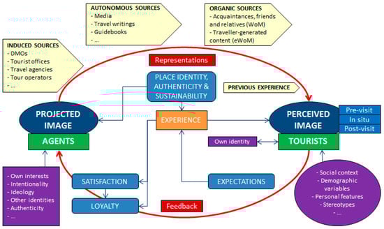 - Place identity and authenticity. Identity and authenticity are part of the projected image [], but can also directly influence the experience through existential authenticity (oriented activity or experienced authenticity) []. These authors demonstrated the relationship between image, authenticity, identity, and place attachment.