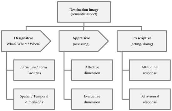 The Pocock and Hudson model and similar ones were adopted in human geography by numerous authors to study human behaviour in relationships of people with the environment [,]. In an article on constructing the image of a country [], the authors compared constructs of Table 1, in terms of country image, from a semantic dimension (meaning): Cognitive component = designative meaning, affective component = appraisive meaning, and conative component = prescriptive meaning, and equating them with the attitude toward the product, from a pragmatic dimension (purpose).