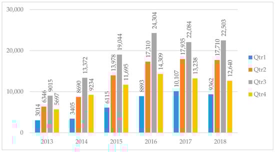 The most-representative language of the OTRs posted by foreign visitors is English. To delimit the temporal dimension, OTRs written in English between 2013 and 2018 were selected. As an exploratory study and to facilitate comparison of the metrics between the three segments, a random sample of 100,000 OTRs in each section was extracted (Table A1, Table A2 and Table A3, Appendix A). The representativeness of the samples was different in each case (75% attractions, 95% hotels, and 60% restaurants). Figure 4 shows the temporal distribution of the sample.