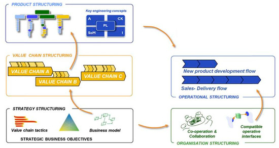 Knowledge acquisition begins with the strategy structure box shown in Figure 5, where the scope of the analysis is defined. The results of the first step provide a suitable base for the workshop, with the businesses, products, and organizations defined and available for discussion. The product or business owner generally has the best available knowledge regarding strategy. After the strategic and organizational goals are defined, the process of creating the product is discussed. This area of the CSL tool includes the lifecycle steps of the product in calendar order, including, for example, market research, product development, sales, and recycling.