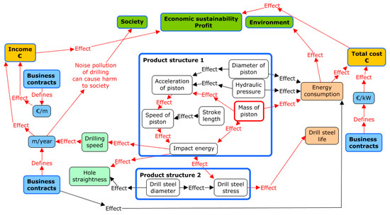 In this phase, the targets from the business environment are set. In step three, the knowledge of the product and its design is used to communicate how the product fulfills its stated goalsFigure 6 shows the simplified design reasoning pattern (DRP) [37] chart from Case Study 1. The boxes at the top of Figure 6 show the final goals of the technology from the perspective of sustainability (safety, profit, and environment, in this example), which were defined in steps one and two of the TVM. On the left are the desired behaviors of the product (drilling speed and hole straightness) and the reasoning for how these behaviors generate income. On the right are the behaviors that generate costs (energy consumption and drill steel life), with the cost reasoning imported from the CSL tool. In the middle of Figure 6, in the large box with the blue outline, are the product structures, which were also defined in the CSL step.