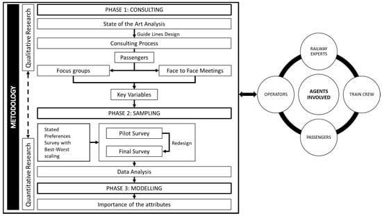 The methodology applied in the study has been divided into two main phases (see Figure 1). The first phase, consultation or the qualitative phase, aims to obtain information from the agents involved on the railway system. The objective is to determine what are the main attributes that affect the choice of the railways compared to other modes. This first phase was based on the use of FGs and in-depth interview techniques. Different stakeholders were involved in this phase such as passengers, railway crew, and railway scholars/experts.