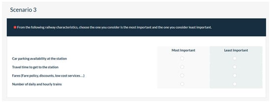 The methodology proposed in this research is based on the combination of qualitative and quantitative techniques. Among the qualitative techniques, Focus Groups (FGs) and the in-depth interviews were chosen. Through this information, a diagnosis of the railway mode was made, obtaining a list of the variables that may influence the choice of railway by transport users. A similar procedure was applied in dell’Olio et al. [] to establish the variables that affect the behaviour of individuals in railway incidents and accidents. Among the quantitative methods, the use of an SP survey is proposed to elaborate a complete ranking of the importance of the variables related to the railway service, based on a Best–Worst (BW) case 1 scaling [].