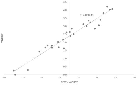 Correlation between the parameters obtained in the MNL model and the Best–Worst operation.