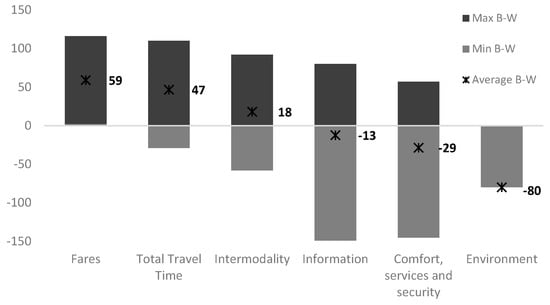 The main contribution of this research is to develop and test a complete methodology for determining the most important attributes of the railway service to different types of transport users. In addition, it has been decided to use a BW survey technique [], which, as far as the authors’ knowledge, has not been directly applied before to the railway field or to define the importance of the different attributes belonging to the railway service. However, this method has been successfully used to analyse the importance of the different attributes belonging to a bus-based urban transport service. This was the case of the study made by Beck and Rose [], where the authors carried out a comparison between the satisfaction and the importance of the different attributes of the public transport service. These authors concluded that, in their case, the BW surveys allowed respondents to be more committed to conducting the questionnaire. In addition, it was possible to capture the difference given to different attributes between importance and satisfaction and its correlation structure, unlike when using traditional rating methods.