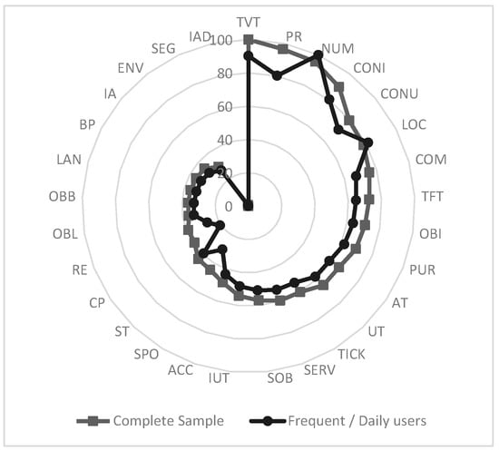 The main difference between frequent users and the rest (Figure 6) is the clear reduction in the importance of ticket prices (attribute PR). In the same way, the travel time slightly reduces its importance, while the service frequency becomes the most important variable. In terms of accessibility and connections with other means of transport, whether urban or interurban, the importance is slightly more reduce, while the location of stations becomes more important. At the bottom of the list, there is a clear reduction in the importance associated with police security, the availability of car parking at stations, and the reservation of seats. Through these variations, we can deduce that regular rail users are those that use the railway for daily commuting. Therefore, the importance of the attributes focuses mainly on having a good frequency of services and that the stations are accessible to their origins and/or destinations.