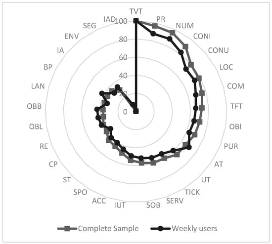 Comparison of the difference in importance given to the attributes by the complete sample and weekly users.