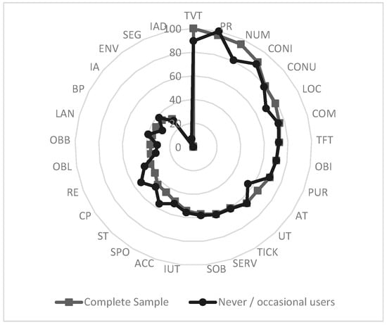 The model coefficients show the differences of each group for every particular attribute. In order to facilitate the visualization, the following graphs (Figure 6, Figure 7 and Figure 8) show the comparisons of each group with respect to the model estimated with the complete sample (Table 6). The graphs are sorted from highest to lowest frequency of railway use.