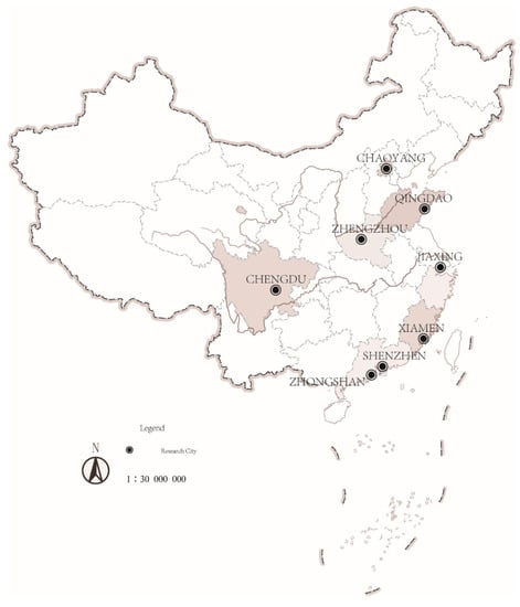 The data used in this study were taken from the 2014 China Migrants Dynamic Survey (CMDS 2014) (http://www.chinaldrk.org.cn/wjw/#/home), which is a large-scale sample survey of migrants in China conducted by the National Health Commission of the People’s Republic of China. We conducted this study using thematic survey data on social integration and health of migrant population collected in eight Chinese cities (Chaoyang District of Beijing, JiaXing, Xiamen, Qingdao, Zhengzhou, Shenzhen, Zhongshan, and Chengdu) (Figure 1). The questionnaire mainly consists of three parts: (1) the socioeconomic status of individuals and their families; (2) social integration; and (3) mental health status. The probability proportional to size (PPS) method is adopted for sampling. The respondents were residents aged between 15 and 59 without local hukou and living in the city for more than one month. After excluding the samples with missing information, there were 6642 valid samples.