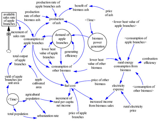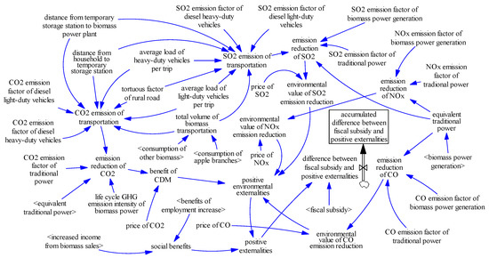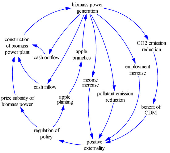 This study explores the feasibility of generating power using apple tree branches as fuel inputs to replace biogas in the primary apple production areas using a case study in Jingning County, Gansu Province. We analyze the economic and environmental benefits, in order to provide theoretical guidance for the promotion of a circular economy model of “apple-biomass power generation-organic fertilizer” in the primary apple production areas and evaluate the reasonableness of the governmental support policy, based on an assessment of the positive externality of biomass power generation. Meanwhile, this study also builds a dynamic system model which can help to ascertain more accurately the subsidy intensity conducive to improving the efficiency of governmental support policies for the development of industries with positive externalities.