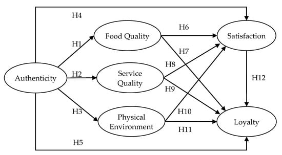 Current research emphasizes that food authenticity should be an antecedent of tourism experience and satisfaction [,,]. Along with authenticity, quality attributes of food tourism, such as food, service, and the physical environment, are also crucial for tourists’ food consumption experience [,,]. Local restaurants are mediums of tourists and local cuisine []. Local food is presented in suitable ways by restaurants so that tourists can accept local food. Accordingly, food tourists are supposed to use three types of quality attributes to judge their gastronomic experience [,]: Functional—food quality; humanic—service quality; and mechanical—the physical environment [,,,,,,,]. Moreover, traditional cooking needs to connect with modern consumers; therefore, quality attributes should be considered to make tourists satisfied and loyal []. However, the effects of food authenticity and quality attributes are not clear [,]. A tourism dining experience can be distinguished into “supporting the consumer experience” and a “peak touristic experience” []. The former shows the importance of the quality attributes of local food, while the latter shows that authenticity is essential for tourists. Obviously, authenticity and quality are indispensable for the tourist food experience. However, little research has addressed the combined effects of quality attributes and food authenticity on tourist satisfaction and behavioral intentions.