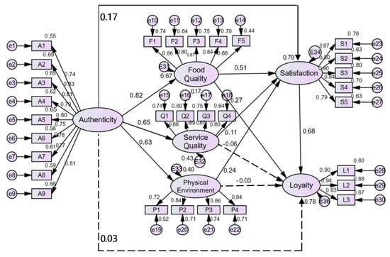The results of descriptive statistics of all constructs are shown in Table 2, and they include means and standard deviations (SD). The values of the means of all constructs exceeded the mid-scale point of 3. The physical environment had the highest mean (PE = 5.70), followed by food authenticity (FA = 5.65), tourist satisfaction (SAT = 5.43), service quality (SQ = 5.43), tourist loyalty (LOY = 5.37), and food quality (FQ = 5.35). The results of a Pearson correlation analysis ranged from 0.526 to 0.817 and was significant at the 0.01 level, which shows that there are significant correlations among these constructs (Table 2).