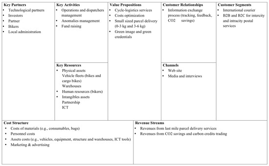 Figure 2 depicts the Business Model Canvas of traditional subcontractors. As discussed in Section 4, international couriers outsource pickups, deliveries, and transportation activities in the last-mile segment of the supply chain to subcontractor couriers, obtaining operational efficiency and customer proximity. Indeed, the international courier benefits from an efficient and flexible management of urban parcel delivery operations, particularly when peaks of demand and strictly temporal constraints typical of certain events and conditions (e.g., prime customers, disaster relief [37]) exist.