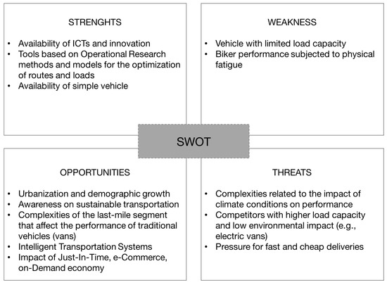 - Uniform. The information gathered in the Go phase must be expressed in a standard form to achieve a shared vision of the MACS. In this phase, the governance mechanisms and business models are investigated using the Business Model Canvas [25]. It is a graphical tool coming from the lean startup movement and it shows how the proposed solution creates value in terms of benefits, products and services, for the different stakeholders. Its strengths rely on its simplicity of use and to highlight in an intuitive and understandable manner, how the integration of traditional transportation modes and green vehicles can deal with the different operators needs and how they can obtain benefits. Moreover, opportunities and threats of this integration are identified using a SWOT analysis. It is a strategic planning method useful to identify strengths, weaknesses, opportunities, and threats related to the different business models in urban freight transportation and parcel delivery.