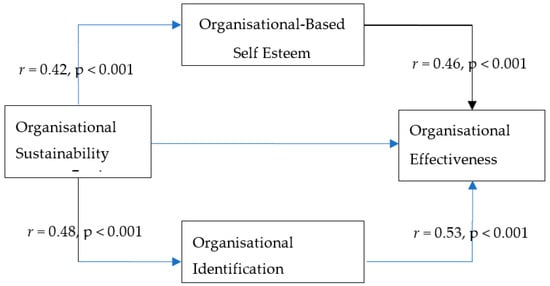 Statistics at the base of Table 2 shows a simple regression analysis, predicting organisational performance from sustainable organisational practices. The R value (0.42) indicates that, as scores on sustainable organisational practices increase, the score on organisational effectiveness increases. This is a significant positive correlation, β = 0.42, p < 0.001. The R2 indicates that sustainable organisational practices account for 18 percent of the variance in organisational effectiveness. On the basis of Cohen’s [44] criterion, R2 of 0.18 indicates a medium effect size. The analysis of variance (ANOVA) test, F (1, 145) = 31.72, p < 0.001, also indicated that the regression is statistically significant. Table 2 shows a partial correlation for the mediating role of organisational identification and OBSE in the relationship between sustainable organisational practices and organisational effectiveness. The correlation between sustainable organisational practices and organisational effectiveness was r = 0.42, p < 0.001. The first-order correlation, when controlling for OBSE, declined to r = 0.36, which is also significant, p < 0.001. The smaller first-order correlation, when compared to the zero-order correlation, indicates that OBSE has a mediating effect on the relationship.
