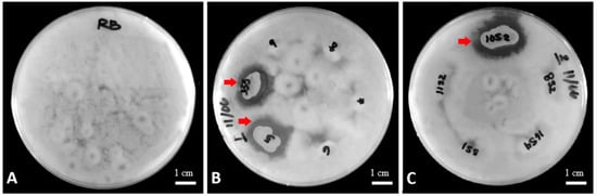 Table 1 lists the most effective bacterial strains among the inhibition tests. The strains were isolated from the different sampling sites of the rice rhizosphere, including those from healthy crops, rice blast-infected crops, and bacterial blight-infected crops. The inhibition zones of the potential biofungicides ranged from 14.5 to 24.3 mm in diameter. Figure 1B,C show the inhibition zones from the most effective bacterial strains ID 5, 3S5, and 10S2.