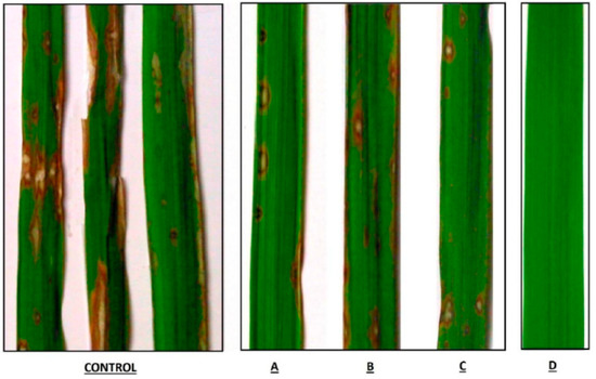 Rice blast disease severity with different treatments (treatments (A–C); (D) represents a healthy leaf). Treatments: (A) B. subtilis 5 biofungicide mixture + B. subtilis 5 liquid biofungicide formula; (B) B. cereus 3S5 biofungicide mixture + B. cereus 3S5 liquid biofungicide formula; (C) P. fluorecens 10S2 biofungicide mixture + P. fluorecens 10S2 liquid biofungicide formula.