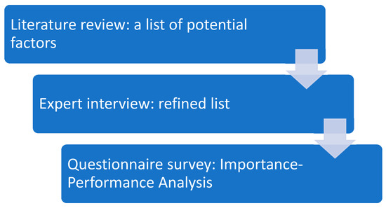 Consequently, a questionnaire survey was conducted with professionals in the prefabrication sector to gauge their expert opinion of how those critical factors are applicable in the Chinese market. Meanwhile, the Importance-Performance Analysis was conducted in order to develop corresponding strategies. Importance-Performance Analysis was proposed by Martilla and James [20] on the purpose of developing strategies based on identified critical factors. The Importance-Performance Analysis consists of following steps: (1) a list of critical factors are identified, (2) each critical factor is evaluated from two dimensions, i.e., level of importance and level of performance, (3) all factors are classified into four groups according to their level of importance and level of performance, i.e., concentrating here, keeping up the good work, low priority, and possible overkill. Since then, Importance-Performance Analysis has been widely employed in management studies [21,22,23]. In the construction context, Importance-Performance Analysis has been conducted in order to understand the sustainability attitude and initiatives of construction enterprises and their employees [24,25,26]. The entire research process is shown in Figure 1.