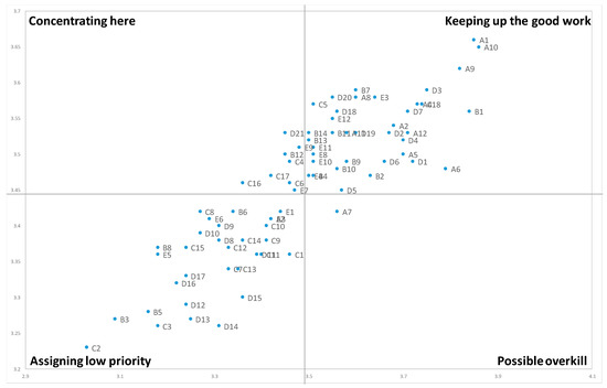 Consequently, Importance-Performance Analysis (IPA) was performed. All risks are classified into one of the IPA quadrants (Figure 2). Quadrants are defined according to the average score of the means.