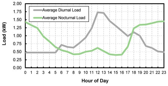 Assessing the impact of different load profiles on battery performance has been considered previously [40,45], but the financial implications were not highlighted with respect to a varying SOC value. For the purposes of the study in this paper, and in interest of keeping the optimization tractable, we restrict the load scenarios to two: a mostly diurnal load and a mostly nocturnal load. For both load profiles, an average daily load of about 20 kW h was studied, which was based on a consumption of a small dwelling in a rural area. For the details, please refer to Table A1 in Appendix A. The load was also modeled throughout the year with an hourly resolution, i.e., 8760 h were considered. Although the profile stays the same, the consumption level does vary between months. Figure 1 shows the average load profiles for the diurnal and nocturnal loads used in this study.