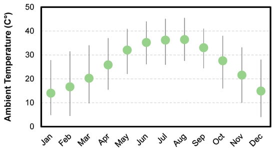The average monthly temperatures in the city of Riyadh, Saudi Arabia. Note that for the purposes of the model, 8760 temperature data points were used for the year (not shown for brevity). Further, the bars show the maximum and minimum temperatures experienced.