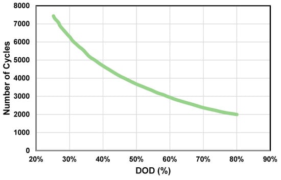 The number of cycles of the battery versus the depth-of-discharge (DOD) (DOD = 1ߞstate of charge (SOC)) based on data provided by the manufacturer. Note that the lower the battery discharges, the shorter the lifetime is.