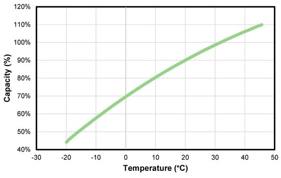 where BC(T) is the battery capacity as a function of temperature, NBC is the nominal battery capacity, δ0,1,2 are the fitted parameters based on the data available, and Tc is the temperature in degrees Celsius. Based on the provided data sheet, the fitted parameters were calculated as: δ0 = 0.706, δ1 = 0.0113, δ2 = −6.3981 × 10−5.