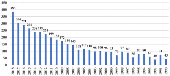 As shown in Figure 1, the number of annual publications exhibited an increasing trend, from 43 articles in 1990 to 385 articles in 2018. The greatest growth occurred in 2007–2018, during which 66.46% of the articles were published.
