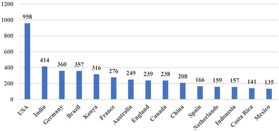 A total of 139 countries/regions published agroforestry related researches from 1990 to 2018. Among these countries, 15 countries have published more than 100 articles (Figure 2). The United States of America (USA) (958, 22.79%) published the most articles, followed by India (414, 9.85%) and Germany (360, 8.56%). Obviously, the USA, India, and Germany have paid a great deal of attention to this field. Nearly half of the top 15 representative countries (7/15) were developing countries.