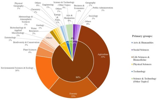 The 4204 articles that were reviewed in this study were divided into six primary groups and 66 subject categories, according to WoS subject categories. The six primary groups include Arts & Humanities, Social Sciences, Life Sciences & Biomedicine, Physical Sciences, and Technology, and Science & Technology (Other Topics). As shown in Figure 3, the most productive primary group are Life Sciences & Biomedicine (85.61%), and the three most common subject categories were Agriculture (34.67%), Forestry (22.64%), and Environmental Sciences & Ecology (16.45%). The other five primary group only account for 14.39%. The common subject categories in the five primary groups are Water Resources (1.65%), Business & Economics (1.39%), and Engineering (1.07%). In conclusion, agroforestry science has been one of the important areas in both natural science and social science.