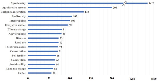 A total of 9887 keywords appeared in the 4204 selected publications. The original data were pre-treated to make the results more reasonable. Similar keywords, such as “Ecosystem services” and “Ecosystem service”; “Agroforestry systems” and “Agroforestry system”; and, “Land-use change” and “Land use change” were merged. After a series of data management processes, there were a total of 9344 keywords. Among these keywords, 73.35% appeared only once and 2.98% appeared more than 10 times. Useful information, such as objectives, methods, and viewpoints, can be obtained from the keywords of a publication [29]. As shown in Figure 4, after excluding the words “Agroforestry” (1426 times) and “Agroforestry system” (200 times), the top three words were “Carbon sequestration” (133 times), “Biodiversity” (105 times), and “Intercropping” (100 times), which were also the most frequently mentioned keywords in research.
