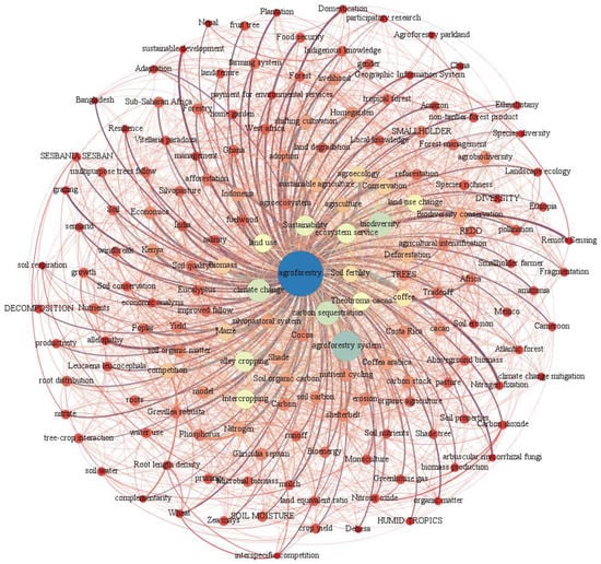 Figure 5 shows the network of the 167 most frequently occurring keywords. The size of the circle represents the total collaboration frequency of a keyword; larger circles represent higher collaboration frequencies. Similarly, the width of the line indicates the collaboration frequency between two keywords. That is, a thicker line represents more frequent collaborations between the two keywords. Not surprisingly, “Agroforestry”, as the keyword of this study, occupies the central position and intermediation. “Agroforestry” is strongly associated with “Carbon sequestration” (50 times), “Ecosystem service” (39 times), “Biodiversity” (39 times), “Coffee” (32 times), “Maize” (31 times), “Climate change” (30 times), and “Conservation” (30 times). Other strong associations include “Nitrogen” and “Phosphorus” (17 times), “Carbon sequestration” and “Soil organic carbon” (14 times), and “Biodiversity” and “Conservation” (11 times).
