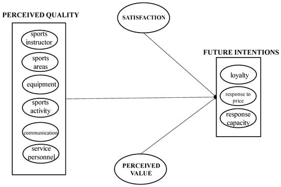 The relationship between the dimensions of quality, satisfaction, and perceived value with the dimension of future intentions of users of sports services.