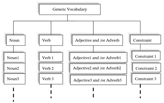 Detailed categorization of concepts involved is indispensable for task knowledge description. This stage provides a fundamental understanding of the relationships among different concepts. Also, in accordance with the elicited concepts given in the previous phase, this stage provides the ontological engineer with an idea about the important axioms that need to be developed in order to decide on the competence of the task ontology. From the standpoint of granularity and generality, following Ikeda et al. [57], the lexical level task ontology consists of four concepts: (1) generic nouns representing objects reflecting their roles that appear in the problem-solving process; (2) generic verbs representing unit activities that appear in the problem-solving process; (3) generic adjectives and/or adverbs modifying the objects; and (4) generic constraints specific to the task. Figure 2 presents the hierarchy of the lexical level task ontology.