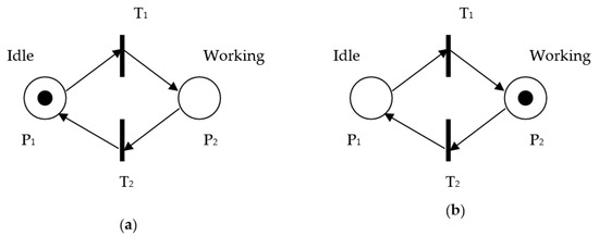 The change of system states, called transition firing, will happen by an event when all the input places hold enough number of tokens. Cassandras and Lafortune [69] further explain that a transition is enabled when each input place P of T contains at least a number of tokens equal to the number of the directed arc connecting P to T. When an enabled transition T1 fires as shown in Figure 4b, it removes the token from its input place and deposits it in its output place. Therefore, the execution rules of a PN include enabling and firing rules are shown as follows [68]: