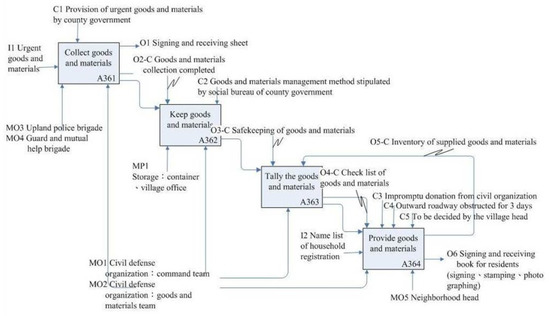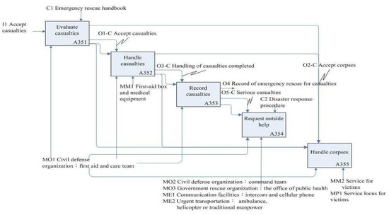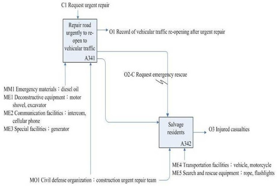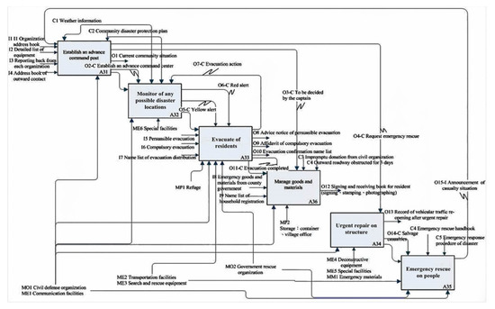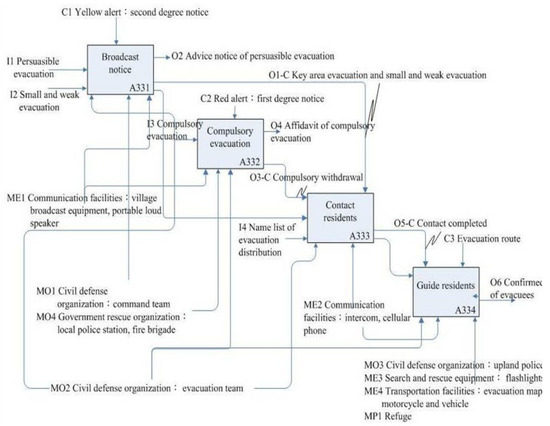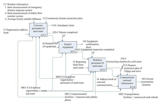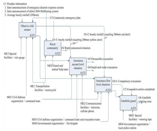“Monitor any possible disaster locations” (A32) was decomposed into five sub-activities, as shown in Figure 8: “Observe wild stream” (A321), “Patrol community” (A322), “Announce first level situation”, (A323), “Announce second level situation” (A324), and “Establish guard” (A325), and its ICOM shown in Table 7. The different mechanisms support different sub-activities as shown in Figure 8. For example, the “Observe wild stream” (A321) and “Patrol community” (A322) were controlled by the “Weather information” (C1) and “Community emergency plan” (C2), while “Establish guard” (A325) was controlled by the “evacuation action completed” (C3). After obtaining the functional IDEF0 model, we then developed the Petri net model for behavior analysis at the next stage.