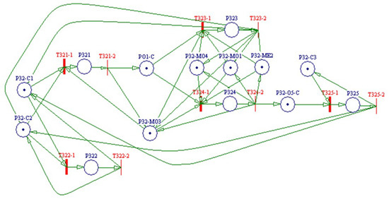 Based on the transformation rules, from static model into dynamic model as suggested by Santarek and Buseif [21], the PN model was constructed for A32′s five activities (A321, A322, A323, A324, and A325) built in the IDEF0 model at the previous stage (Figure 8), as shown in Figure 13. Following the Tr1 andTr2 transformation rules, the PN model generated the following places: P321, P322, P323, P324, P325, P32-C1, P32-C2, P32-C3, P32-O1-C, P32-O5-C and transitions: T321-1, T321-2, T322-1, T322-2, T323-1, T323-2, T324-1, T324-2, T325-1, and T325-2 described in Table 8. The transformation rule, Tr3 (1) and (2), was used for the mechanisms to produce places P32-MO1, P32-MO3, P32-MO4, and P32-ME2 (Table 8). The PN model for “Monitor any possible disaster locations” (A32) consisted of 14 places and 10 transitions (Table 8).