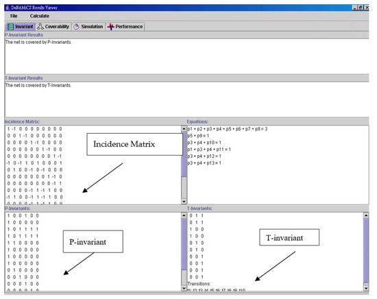 After constructing the PN model, a DaNAMiCS software package was used to verify the behavioral properties of the developed Petri net model. The incidence matrix (D), P-invariants, and T-invariants are shown in Figure 14. The nonzero nonnegative integer entries in a P-invariant, such as [1,1,1,1,1,1,1,1,0,0,0,0,0], [0,0,0,0,1,0,0,0,1,0,0,0,0], [0,0,1,1,0,0,0,0,0,1,0,0,0], [1,0,1,1,0,0,0,0,0,0,1,0,0], [0,0,1,1,0,0,0,0,0,0,0,1,0], [0,0,1,1,0,0,0,0,0,0,0,0,1], revealed that the weights associated with the corresponding place as such that the weighted sum of tokens on these places was constant for all marking reachable from an initial marking. Similarly, for the purpose of avoiding deadlock, the nonzero nonnegative integer entries in a T-invariant, such as [0,0,1,1,0,0,0,0,0,0], [1,1,0,0,1,1,0,0,0,0], [1,1,0,0,0,0,1,1,1,1], represented not only the firing counts of the corresponding transitions that belonged to a firing sequence transforming a marking m0 back to m0, but also the number of times these transitions appeared in this sequence.