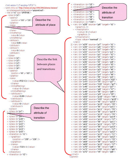 At the symbol level model (the bottom layer in Figure 1), in order to interweave understandable human symbols with a machine-readable format effectively, PNML was adopted as a starting point for a standard interchange format for Petri nets. The XML-based interchange format for the A32 Petri net model is shown in Figure 15. The relationships between the places and transitions and attributes of transitions are noted in this figure.