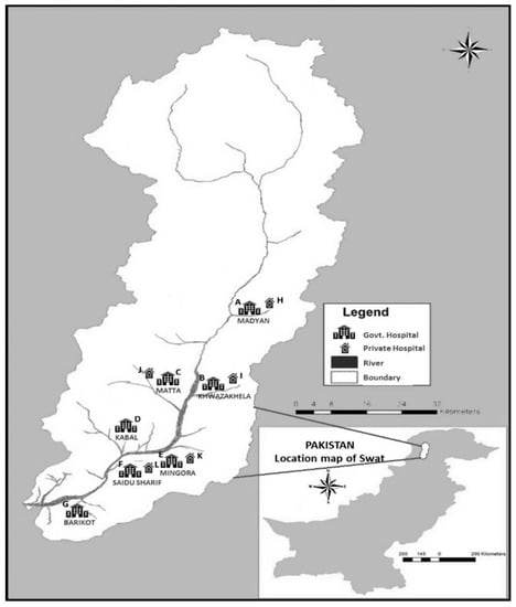 This research includes seven government-owned hospitals and five private-owned hospitals located in Swat District, Pakistan. These structures supply a wide range of basic medical and surgery services, as well as some specialist ones, like maternity and pediatrics. In this study, each hospital is associated with a simple alphabetical letter, to simplify its identification. Figure 1 indicates the locations of the selected hospitals.
