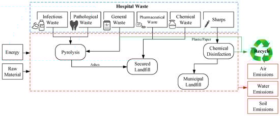 By definition, hospital waste is any kind of waste generated in the process of immunization, treatment and diagnosis of humans and animals, as well as in the testing of biological specimens, also for research purposes [1,2]. Its management implicates the supervision of waste generated by hospitals’ activities [3]. Medical actions shield life and restore health. However, they also create a lot of medical waste and by-products, like non-sharps, infected sharps, blood, hazardous chemicals, body parts, pathological residues, medical devices, pharmaceuticals and radioactive materials [4,5,6]. These, in turn, might lead to hazardous human health impacts, including teratogenic, mutagenic and carcinogenic effects, reproductive and respiratory systems damages, central nervous system effects, diarrhea, typhoid, leptospirosis, cholera, human hepatitis B and C viruses and acquired immunodeficiency syndrome (AIDS). Environmental annoyance may also occur due to odors, cockroaches, flies, vermin and rodents [1,5,7].