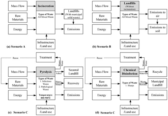 Flow chart of hospital waste treatment. (a) Scenario A: Mixed waste incineration followed by landfilling; (b) Scenario B: Mixed waste landfilling without incineration. (c,d) are the parallel processes of Scenario C. In particular (c) describes the pyrolysis treatment, which can be applied to infectious and pathological waste, while (d) refers to chemical disinfection treatment.