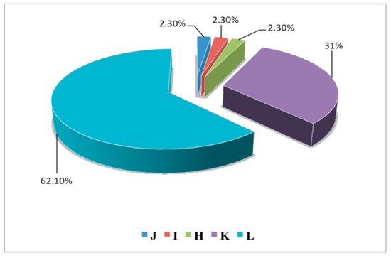 Of the total government hospital produced (E) Central Hospital Mingora (GH) produces 52%, (F) Saidu Teaching hospital (GH) produces 17%, (G) Civil Hospital Barikot (GH) produces 4.10%, (D) Civil Hospital Kabal (GH) produces 6.50%, (C) Zakir Shaheed Government hospital Matta (GH) produces 14%, (B) Civil Hospital Khwazakhela (GH) produces 3.40%, (A) Civil Hospital Madyan (GH) produces 3%. With respect to the amount of waste generated by private hospitals, (J) Hamdard Medical Center Matta produces (PH) 2.30%, (I) Gull Medical Center Khwazakhela (PH) produces 2.30%, (H) Hamid medical complex Madyan (PH) produces 2.30%, (K) Shifa Medical Center produces (PH) 31%, and (L) Swat Medical Complex (PH) produces 62.10% of the total as shown in Figure 4 and Figure 5.