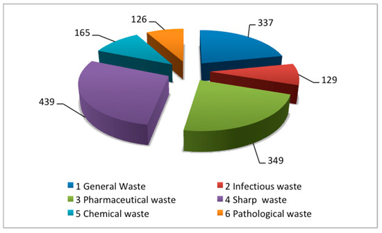Field activities allowed us to classify the collected MW, according to different standardized categories, as defined by [36]. General waste refers to solid waste, generated during activities other than direct medical ones (e.g., waste from offices, cafeteria, etc.). Infectious and potentially infectious wastes are considered as sub-component of microbiology and biotechnology waste. Pharmaceutical waste belongs to the category of medicines and cytotoxic drugs. Waste sharps (both used and unused) include blades, needles, scalpels, syringes, scalpels, glass and similar materials, which might cause cuts or punctures. Chemical waste refers to chemicals used in as treatment or disinfection materials.
